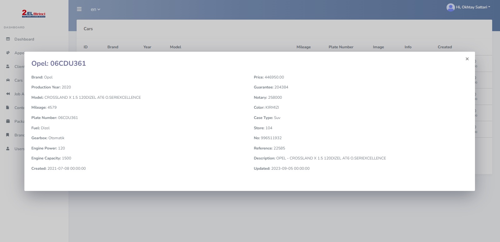 A REST API was developed using Laravel framework, and based on the developed API, Vue.js based client application was developed as an administration panel. This system provides functionalities for user management, customer management, car brand management, car service package management, website content management, job applicant/application management, used car listing view and car service appointment management.