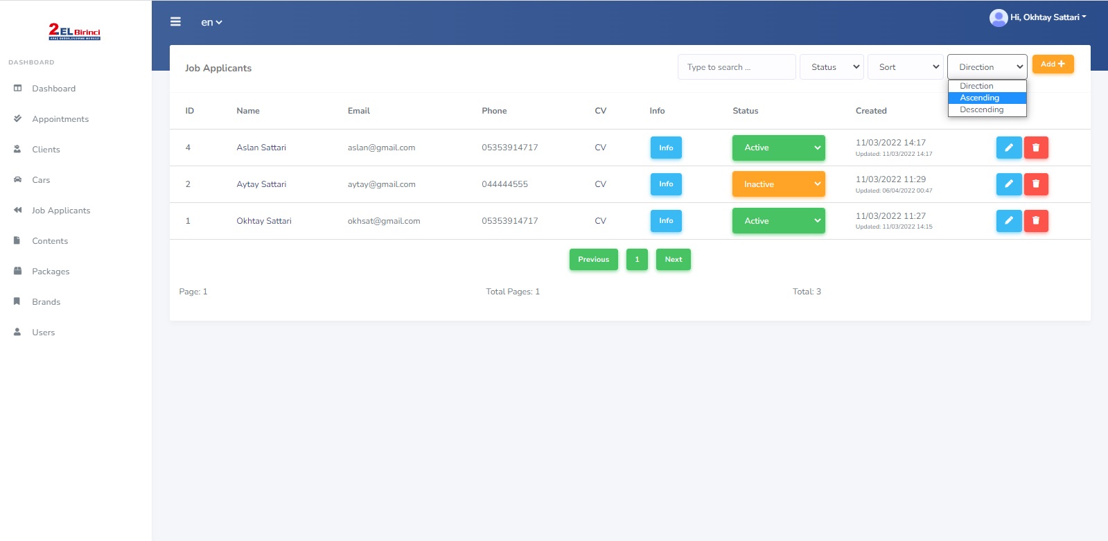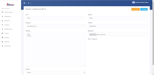 All supported car brands and car service packages can be managed from the administration panel. In addition, the contents of various sections of the website and the user and customer accounts of the system can be managed from the administration panel. There is also a section in the administration panel where job applications from the company's website can be viewed and managed.