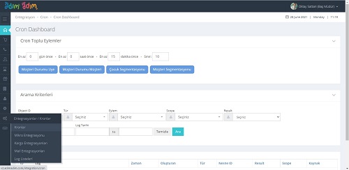 Various cron job functions were implemented in the system to run some scheduled inter-system or internal processes, such as sending orders and customers data to the accounting system, shipping system, mail/SMS systems, and internal customer segmentation processes. Thus, cron job processes can be set up and scheduled on the server for data communication with cargo services, mail and messaging services, automatic payment services, and the accounting system.